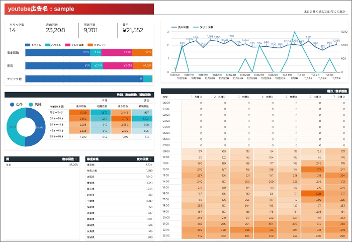 設定した地域、時間帯、ユーザーの「性別」「年齢」などで、表示されただけの「表示回数」と、広告で視聴や行動があった「視聴回数」を毎週月曜日に集計してメール送付いたします。